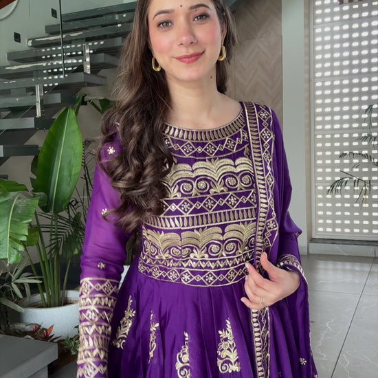 Elegant floor-length Anarkali gowns in teal blue and royal purple, crafted from georgette fabric with intricate golden embroidery and matching dupattas. Perfect for weddings, festive occasions, and parties.